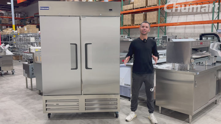 The Polarman PLM-54FS two-section reach-in freezer maintains temperatures to -10 degrees Fahrenheit and offers a 49-cubic-foot capacity, providing exceptional refrigeration performance for commercial kitchens. This model features a bottom-mounted, self-contained refrigeration system, an electronic thermostat, and a digital LED temperature display for precise, easy-to-read temperature control.