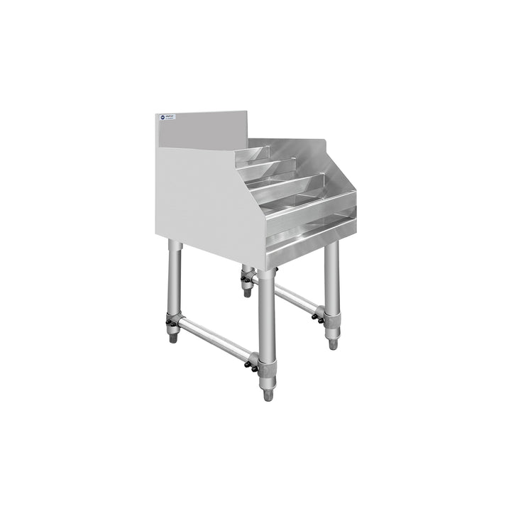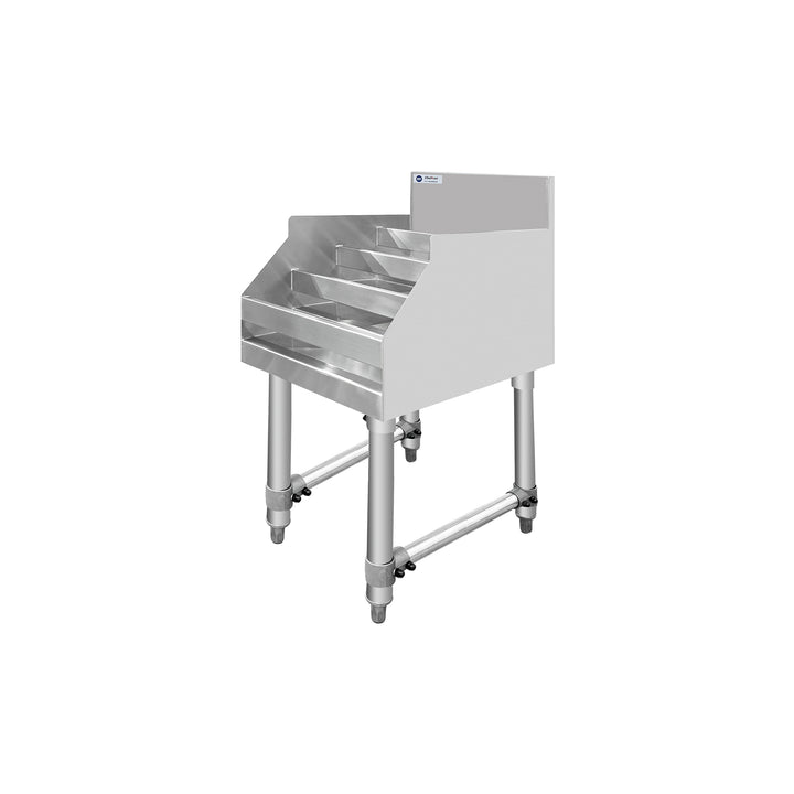 The ChefAsst CA-LD1223-316 wine display rack features a five-tier design that holds approximately 15 bottles of wine, allowing for convenient and organized display of your wines, maximizing product visibility and accessibility. Made of 16-gauge 304 stainless steel, it's both durable and easy to clean. It's also suitable for high-traffic bar environments. A splash guard prevents spills, keeping the area clean. Steel straps securely hold bottles, preventing them from moving and ensuring stability. Its versatile design includes stainless steel legs and adjustable plastic bullet feet for stability even on uneven surfaces. Its compact 12-inch width allows it to fit seamlessly into tight spaces and easily fit at the back of nearly any bar, ensuring bartenders can work efficiently.