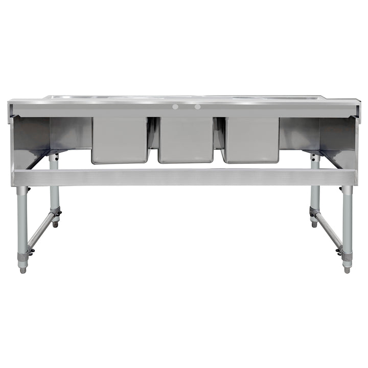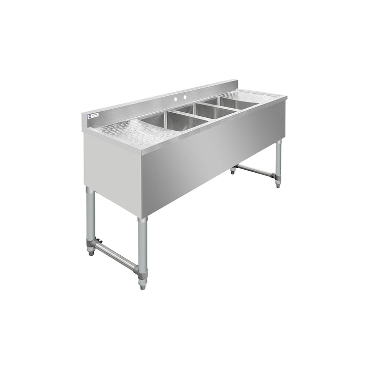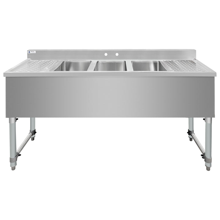ChefAsst 60" CA-BS101410-13LR-318 18-Gauge 304 Stainless Steel Three Bar Sink with Galvanized Legs, Cross Bracing, and Two 13" Drainboards - 10" x 14" x 10" Bowl