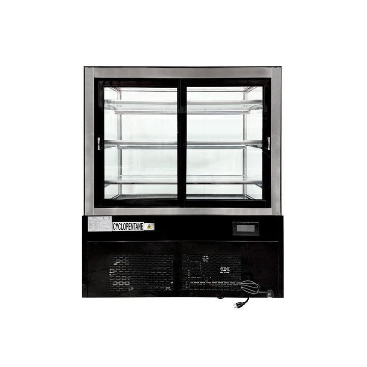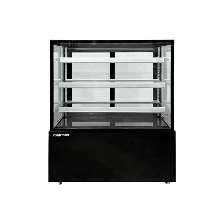 The Polarman PLM-371SB refrigerated pastry display cabinet features a straight-front glass panel design with three built-in display shelves for organized pastry and cake presentation. Its 48-inch wide body includes dual-zone full-access operation channels, while reinforced glass sliding doors and side panels maximize product visibility. The black exterior creates a professional display interface, complemented by a durable stainless steel interior and a controllable LED lighting system that precisely highlights displayed items.