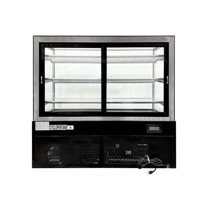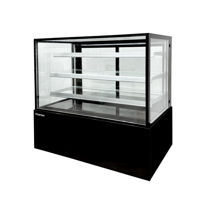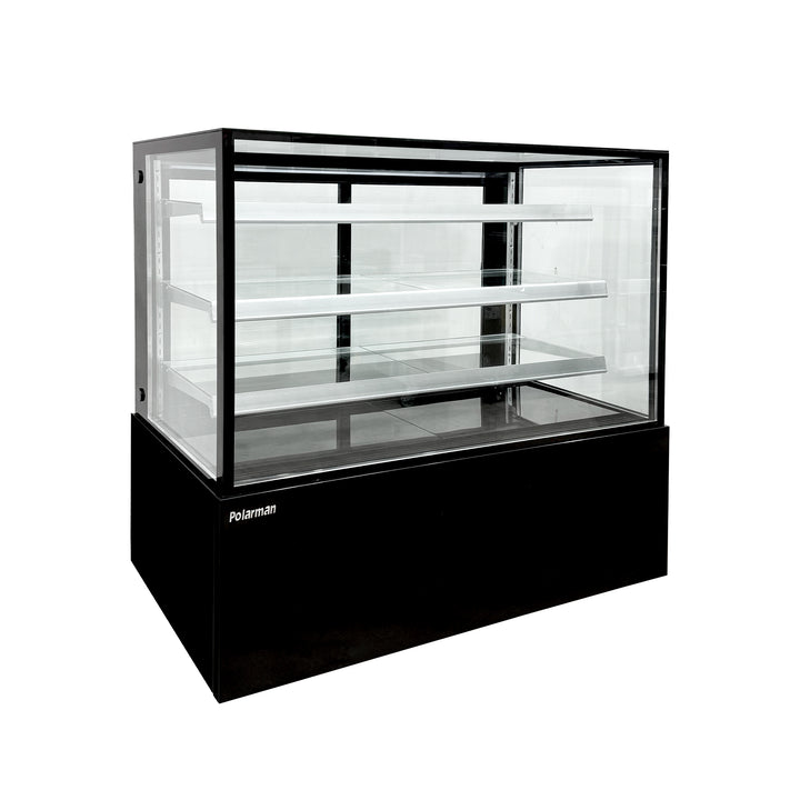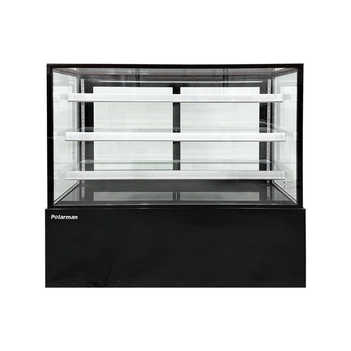 The Polarman PLM-471SB refrigerated pastry display cabinet features a straight-front glass panel design with three built-in display shelves for organized pastry and cake presentation. Its 60-inch wide body includes dual-zone full-access operation channels, while reinforced glass sliding doors and side panels maximize product visibility. The black exterior creates a professional display interface, complemented by a durable stainless steel interior and a controllable LED lighting system that precisely highlights displayed items.